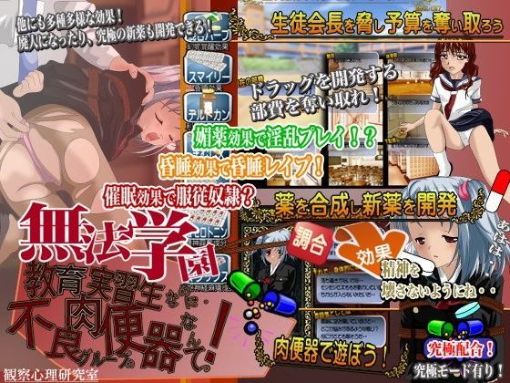 斬新なアイデアでまったく新しい効果をもつドラッグを作りだそう! 無法地帯と化した学園で恐喝やドラッグ暴行! やりたい放題! <無法学園を暴力支配> 無法学園、鋼の鉄則! 暴力! 狙った獲物をドラッグ漬けにするため学園生活を開始! 学園を暴力で支配しドラッグ開発の予算を作り出せ! <薬を合成し新薬を開発> 自由にオリジナルの新薬を調合し憧れの天才少女をビ…